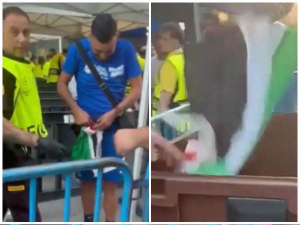 רגע לפני המפגש בין ריאל מדריד למארסיי הערב (שלישי) בפתיחת ליגת האלופות, אוהד שרצה להכניס את דגל פלסטין ליציע בסנטיאגו ברנבאו נתקל בכוחות האבטחה שמנעו ממנו לעשות כך. "הדגל הזה לא נכנס", אמרו אנשי האבטחה שדרשו מהאוהד להשאיר את הדגל מחוץ לתחומי האצטדיון. צפו בקטע בנגן הווידאו למעלה >>