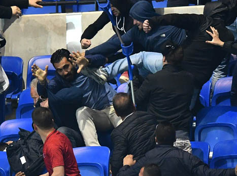 חלק מהאוהדים הטורקים אף השליכו אבוקות לעבר יציעי ליון. הקהל הצרפתי נס בפאניקה לתוך תחומי המגרש על מנת לתפוס מחסה. המשטרה, נאלצה להשתמש בגז מדמיע, כדי להפריד בין הניצים. בצרפת דיווחו כי נשיא ליון, ז'אן מישל אולאס, עלה ליציע הוויראג' סוד, על מנת לנסות להרגיע את האוהדים המקומיים ופונה בהתערבות כוחות האבטחה.
