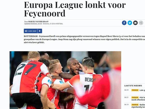 "הליגה האירופית מתקרבת לפיינורד", נכתב בכותרת של ה"טלחראף", "היא תגיע לישראל למשחק שנראה לפרוטוקול בלבד". ב"NOS" התייחסו גם להפועל ב"ש: "כצפוי, היא התבצרה ואיפשרה לפיינורד לשלוט במשחק, אבל נייג'ל האסלביינק כמעט עקץ".