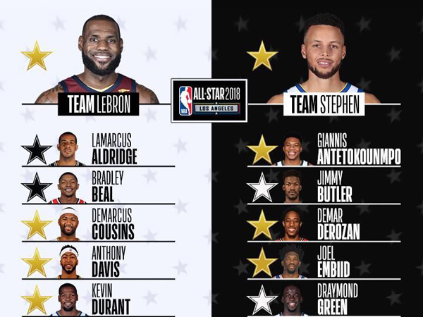 בצד של קרי, ניתן למצוא את אנטטוקומפו, במה שיכול להיות שיתוף פעולה מעניין במיוחד. גם ג'יימס הארדן, ג'ואל אמביד ודמאר דרוזן בחמישייה של כוכב הווריירס, שבחר גם בחברו קליי תומפסון. אגב, קרי התבדח וטען שבחר ביאניס בגלל שהטביע עליו במשחק האולסטאר של השנה שעברה.