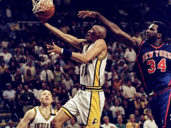 ה-סדרה בין הפייסרס לניקס. אינדי דורגה 2, ניו יורק 3 והן נפגשו בחצי גמר המזרח. במשחק 1, בגארדן, הניקס הובילו 99:105 עם 18.7 שניות על השעון. גיים אובר? הצחקתם את מילר. אחרי אסיסט ממארק ג'קסון, רג'י צלף שלשה ומיד חטף את הוצאת הכדור של אנתוני מייסון, אחרי ספק עבירה. הוא כדרר החוצה לעבר קשת השלוש וקלע שלשה קשה מאוד, תוך שהוא משאיר את הקהל בגארדן ובעיקר את הנמסיס ספייק לי עם פה פעור. ג'ון סטארקס נשלח לקו, החטיא פעמיים ואחרי שיואינג החטיא את הריבאונד, מילר לקח את הכדור, סחט עבירה וקלע פעמיים מהקו. בסך הכול, 8 נקודות ב-8.9 שניות, בדרך ל-105:107 מדהים בסיום. את המשחק עצמו הוא סיים עם 31 נקודות והסדרה המטורפת הזו נמשכה עם 1:3 של הפייסרס, סל ניצחון של יואינג, 3:3 וניצחון חוץ של הפייסרס בגארדן במשחק 7 אחרי שיואינג קלע את זריקת השוויון האפשרית רק אחרי הבאזר. הניצחון בסדרה הזו היה גם הנקמה של אינדיאנה על מה שקרה שנה קודם לכן...
