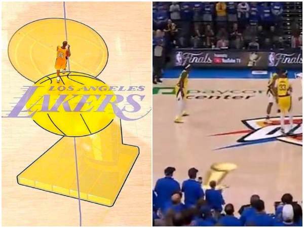 אגב, בגבר גביע ה-NBA, סמל הגביע דווקא כן מופיע על הפרקט>>