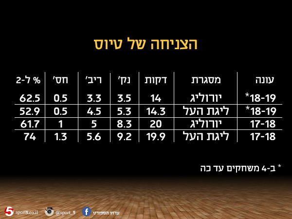 אם בוחנים את התפקוד של טיוס יותר לעומק, מגלים לא מעט נסיבות מקלות. ראשית, כמות הדקות: בעונה שעברה הוא זכה לכ-20 דקות בממוצע בכל המסגרות, והעונה הזמן שלו על הפרקט צומצם לכ-14 בלבד, ביורוליג ובליגה. כאן עולה שאלת הביצה והתרנגולת: האם טיוס נותן תפוקה פחותה ולכן מקבל פחות דקות, או שמא בגלל הכמות המופחתת של זמן משחק הוא מעמיד מספרים פחות טובים?