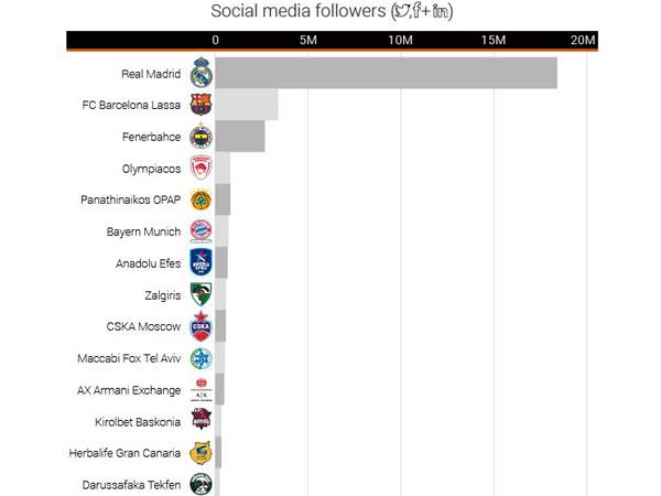 בנוסף, במחקר נבדקה גם הפעילות של הקבוצות ברשתות החברתיות ובאופן לא מפתיע בכלל, ריאל מדריד כבשה את הפסגה עם 18.3 עוקבים, בפער עצום מהשנייה, ברצלונה (3.3 עוקבים). איפה מכבי ת"א נמצאת? במקום העשירי עם קצת יותר ממיליון עוקבים.