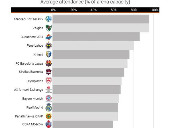 במחקר שנערך על ידי העיתונאי הסרבי סימטרי צ'ורצ'יץ' מאתר RunRepeat, מסתמן שמכבי ת"א מילאה 95 אחוזים מהיכל מנורה בממוצע למשחק. בכך, היא ניצבת במקום הראשון מבין קבוצות היורוליג בקטגוריה יחד עם ז'לגיריס קובנה של שאראס. מי שסוגרת את השלישיה הראשונה, באופן מפתיע היא בודוצ'נוסט שממלאת 87 אחוזים במוראקה.