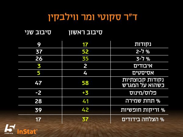 במאפיינים המתקדמים באדיבות פלטפורמת הסטטיסטיקה Instat, בולטים שלושה פרמטרים: בדקות של ווילבקין על המגרש בסיבוב השני, נתח הנקודות של מכבי כקבוצה צנח ב-19% לעומת הסיבוב הראשון. עם ווילבקין על הפרקט, מכבי קולעת 47 נק' בממוצע בסיבוב השני, לעומת 58 נק׳ בסיבוב הראשון.