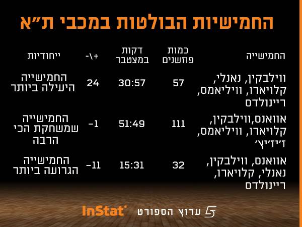 גם בתוך מכבי מתקשים לשים את האצבע על הסיבות המקצועיות שהובילו למשבר הנוכחי. מבט מעמיק יותר על החמישיות שאיתן יאניס ספרופולוס יוצא למלחמה, מגלה שגם כלי הנשק הקיימים פשוט לא מספיק טובים. כשבודקים יעילות של חמישייה, הפרמטרים העיקריים הם כמות הזמן שהיא על המגרש, לצד נתון הפלוס/מינוס. באמצעות פלטפורמת הסטטיסטיקה המתקדמת Instat, מצאנו כי העונה כל החמישיות האפשרויות ששיחקו העונה לא הניבו יותר מפלוס 7 נקודות בממוצע למשחק. לשם השוואה, החמישיות הטובות ביותר בעונה שעברה, רשמו פלוס של 11-12 נקודות בממוצע למשחק.