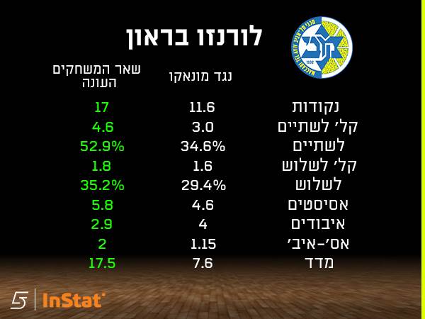 הסיפור עם בראון שונה: המדדים שלו מול מונאקו טובים פחות בהשוואה לשאר העונה, אך זה בעיקר נובע מכך שהמשחק החלש ביותר שלו העונה היה מול הקבוצה הצרפתית בחוץ - אותו הוא סיים מדד יעילות 0. לזכותו ייאמר שהוא פיצה על כך עם משחק טוב מאוד לפני יומיים.