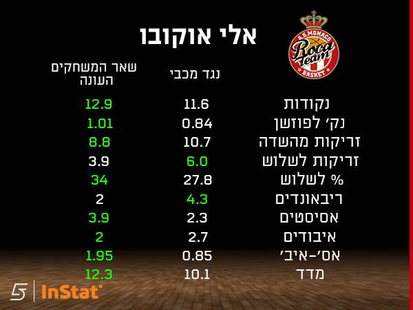 המספרים של ג׳ורדן לויד טובים יותר מול הצהובים, אבל אחרי שקלע 36 נקודות בשני משחקי העונה הרגילה, הוא הוגבל ל-4 בלבד במשחק הקודם. גם אלי אוקובו, הגארד המוביל הנוסף של מונאקו, יורד כמעט בכל הפרמטרים החשובים: נקודות, אסיסטים, אחוזים ומדד, כשמעניין לראות שדווקא בריבאונדים ישנה עליה במספרים של הגארדים. גם בעובדה הזו גם נעוצה שמול מכבי ת״א מונאקו מייצרת פחות נקודות במעבר בממוצע למשחק: 9.1 נקודות בממוצע בעונת היורוליג לעומת 7.3 מול מכבי ת״א.
