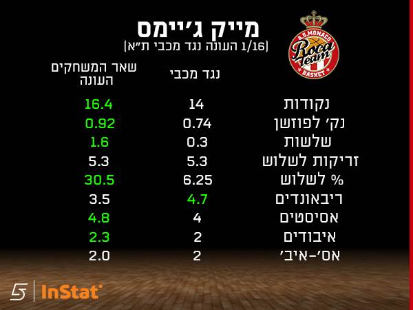 הסיפור אפילו יותר מעניין כשמנתחים את הגארדים של מונאקו, בעיקר את מייק ג׳יימס - אחד השחקנים הטובים ביותר ביורוליג. אלא שכנראה שעודד קטש, שלא ממש רצה אותו בקיץ, הצליח למצוא את הנוסחה (לפחות עד עכשיו). ג׳יימס קולע פחות, מוסר פחות ומאבד יותר מול הצהובים, והנתון המדהים הוא 6% משלוש בשלושת המפגשים מול הצהובים - 1 מ-16, 0.3 שלשות למשחק.