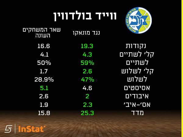 מי שמביא את עצמו למשחקים הללו הוא בעיקר בולדווין, שמציג מספרים אדירים כשהוא רואה מולו את מייק ג׳יימס וחבריו. המדדים שלו מול מונאקו עולים באופן מרשים למדי, מ-16.6 נקודות ל-19.3, כשבאופן כללי הוא טוב יותר כמעט בכל פרמטר מול הקבוצה מהנסיכות. הבולטים שבהם הם האחוזים מחוץ לקשת (47% ל-3 מול 28.9%) ומדד של 25.3 בהשוואה ל-15.8 בשאר משחקי העונה.