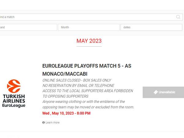 כעת ולאחר שבמונאקו ראו שאוהדי מכבי הצליחו לשים ידם על לא מעט כרטיסים במשחקי החוץ הקודמים, הוחלט כי מכירת הכרטיסים תתבצע אך ורק עבור מנויי הקבוצה. נכון לרגע זה אגב לא ניתן לרכוש כלל כרטיסים באינטרנט, כאשר באתר הכרטיסים של מונאקו נכתב כי האפשרות היחידה לרכישה היא בקופות המועדון.