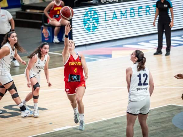 הנבחרת פתחה עם איילה אורן, גל רביב, מעין כהן, מיקה ביתן ותמר כהן. ישראל פתחה טוב ועלתה ליתרון 8:9, כולל חמש נקודות של רביב, אבל יתרון העומק של ספרד החל לבוא לידי ביטוי, ובזכות ריצת 0:12, כולל שתי שלשות של מרתה פרננדז, סיימה את הרבע ביתרון 17:25. שתי הנבחרות התקשו בפתיחת הרבע השני, חמש נקודות של מאיה זילברשלג ושתי שלשות של מעין כהן צימקו ל-32:36 פחות מארבע דקות להפסקה, אבל הספרדיות שוב פתחו מבערים עם ריצת 4:14, הרבה בזכות היתרון הפיזי מתחת לסלים, כדי לרדת למחצית ביתרון 36:50.