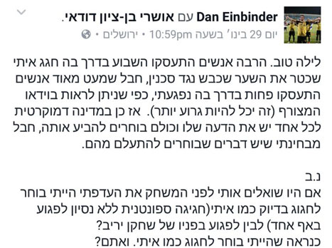 יותר מבכל עונה אחרת, שחקני ליגת העל פונים לרשתות החברתיות כדי לבטא את עצמם. אחרי שמאור בוזגלו ואליניב ברדה עשו זאת לפניהם, דן איינבינדר ואיתי שכטר פירסמו פוסטים בתגובה לביקורת על החגיגה של החלוץ עם כיפה לאחר השער מול בני סכנין בגביע.