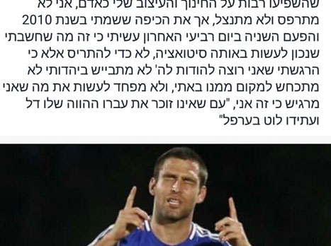 "אני לא מתרפס ולא מתנצל, אך עשיתי מה שחשבתי שנכון לעשות באותה סיטואציה, לא כדי להתריס, אלא כי הרגשתי שאני רוצה להודות לה', לא מתבייש ביהדותי, לא מתכחש למקום ממנו באתי ולא מפחד לעשות את מה שאני מרגיש כי זה אני".