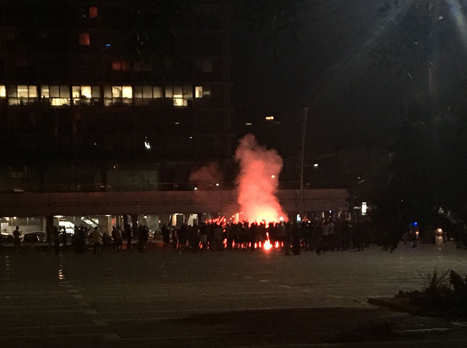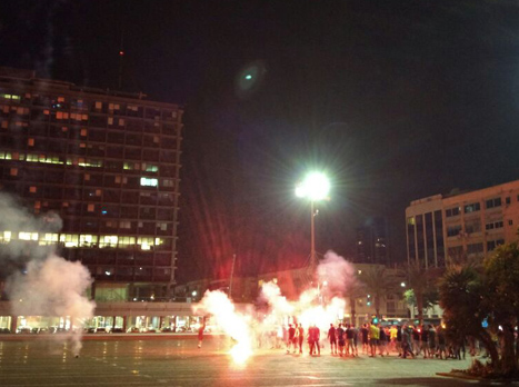 בעוד שהאוהדים האדומים מבכים את גורלם, מהצד השני של הכביש הפכו את המאורע לחגיגה. כ-350 אוהדי מכבי תל אביב הגיעו לכיכר רבין על מנת לחגוג את הירידה של היריבה העירונית והמושבעת, הדליקו אבוקות ושרו שירים. למקום הגיעו גם חמש ניידות משטרה. גם ברחבי הרשת כמובן לא נשארו אדישים והגיבו בכל העוצמה לסיפור הכי גדול העונה בכדורגל הישראלי.
