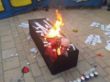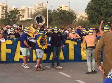 מסביב לאצטדיון המושבה, האוהדים הצהובים הדליקו נרות נשמה, שרו שירי גנאי ואף שרפו צעיפים של הפועל ת"א. מדובר בהמשך ישיר של החגיגות שהקהל ביצע אמש, כש-350 הגיעו לכיכר רבין והדליקו אבוקות כדי לציין את ירידת הליגה האדומה.