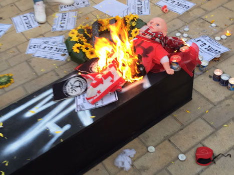 רגע לפני המשחק הערב (ראשון) באיצטדיון המושבה, אוהדי מכבי ת"א ביצעו "מסע הלוויה", בה פיזרו עשרות מודעות אבל על מותה של הפועל ת"א.