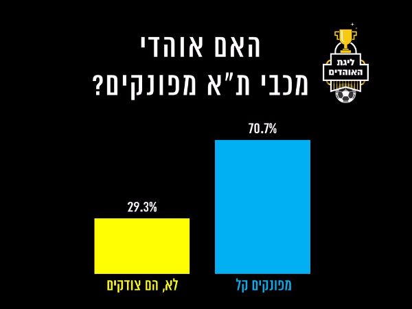 ראשית, 70.7 אחוזים מהאוהדים שמשחקים בליגת האוהדים חושבים שאוהדי מכבי ת"א מפונקים. למרות זאת, אם חותכים מהם את החלק היחסי של אוהדי הצהובים, שתכף נגיע אליו, מקבלים מספר גבוה יותר, של 77.8 אחוזים מהאוהדים שחושבים שהקהל הצהוב מפונק.