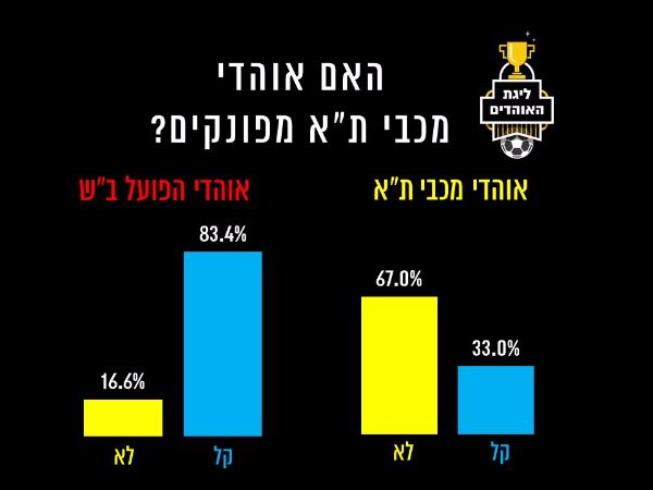 בניגוד למצופה, גם אוהדי מכבי ת"א לא ממש עשו לעצמם הנחות. רק 67 אחוזים מהאוהדים חושבים שהקהל של סגנית האלופה וסגנית מחזיקת הגביע לא מפונק. כלומר, אחד מכל שלושה אוהדי מכבי ת"א כן חושב שהקהל של הקבוצה מפונק. אוהדי היריבות לא ממש עשו הנחות לצהובים: 77.1 אחוז מאוהדי מכבי חיפה חושבים שהאוהדים הצהובים מפונקים, בדיוק כמו 76 אחוז מאוהדי בית"ר ירושלים ו-83.4 מאוהדי הפועל ב"ש. אוהדי הפועל ת"א, שסובלים בליגה הלאומית, ניפקו את האחוז הגבוה ביותר בסקר הזה: 91.7 אחוז מהם חושבים שאוהדי מכבי ת"א מפונקים.