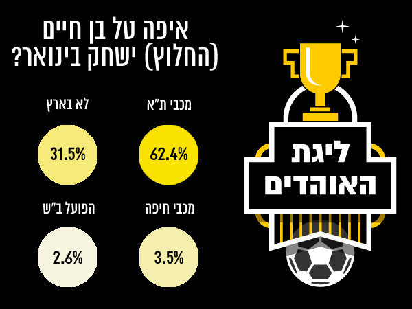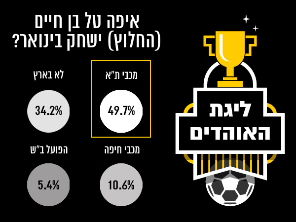 השבוע האחרון היה מוצף בידיעות על כך שטל בן חיים החלוץ, שעזב את מכבי תל אביב רק בקיץ האחרון לטובת ספרטה פראג, הגיע לסיום דרכו במועדון הצ'כי ושסביר להניח שבחלון ההעברות של ינואר ישוחרר מהקבוצה. לכן מיד שאלנו אתכם באמצעות ליגת האוהדים, התחרות היחידה שמדרגת את אוהדי הכדורגל בישראל מבית ערוץ הספורט וחברת "פאנס ליג" (להורדה לאייפון או לאנדרואיד), איפה הוא יחתום בינואר: מכבי ת"א, הפועל ב"ש, מכבי חיפה – ואולי פשוט לא יחזור לארץ.