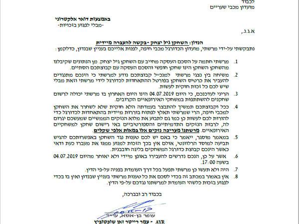 בנוסף, הירוקים איימו במכתב כי אם שעריים תמשיך להתבצר בעמדתה, הם ייאלצו לפתוח בבוררות מיידית בהתאחדות לכדורגל כדי לתבוע את מלוא הנזקים, לרבות נזקים תדמיתיים וספורטיביים באי רישום שחקן לאירופה. לפי חיפה, הנזק מוערך במאות אלפי שקלים.