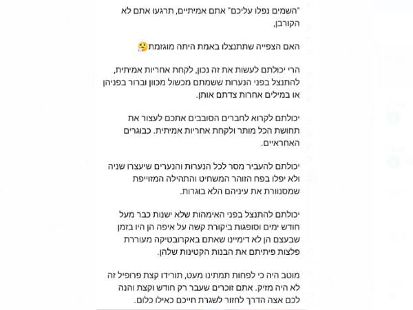 "אני קוראת ולא מאמינה. מה ניסיתם לעשות כאן? ככה בכאילו על הדרך ניסיון מגוחך של התנצלות כלפי מי בדיוק? ואתם ממשיכים באותה הדרך- הנערות הציגו עצמן כבגירות? בגירה במדינת ישראל זה גיל 18 - את זה לפחות היום אתם כבר אמורים לדעת? והרי אתם יודעים שמה שאתם כותבים לא אמת נכון ומדוייק. למה להמשיך לפגוע. קחו אחריות".