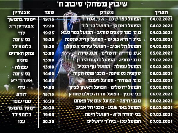 כמו כן, פורסמו התאריכים לסיבוב ח' בגביע המדינה, בין ה-4.2 ל-7.2. המשחק הגדול בין מכבי תל אביב להפועל באר שבע ב-6.2, כמו גם המפגש בין מכבי חיפה להפועל אום אל פאחם.