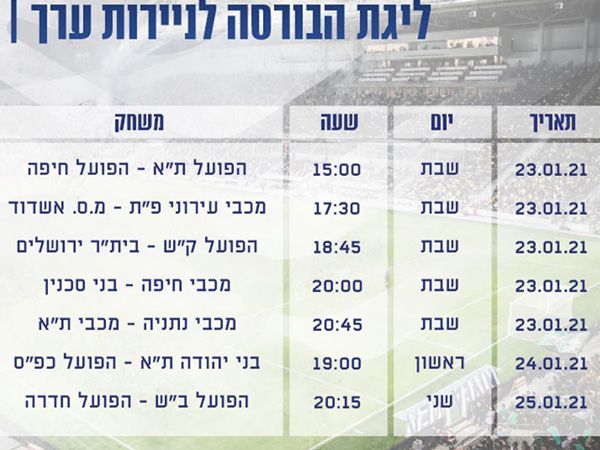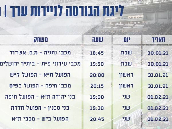 ביום שבת (23.1) ייערך המשחק המרכזי בין מכבי נתניה למכבי תל אביב. עוד באותו יום, מכבי פתח תקווה תפגוש את מ.ס אשדוד, הפועל חיפה את הפועל תל אביב, ק"ש מול בית"ר ירושלים ומכבי חיפה נגד סכנין.