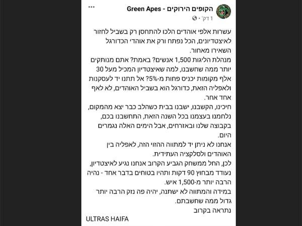 ארגון הקופים הירוקים העביר מסר למנהלת: "אם המתווה לא ישתנה, יהיה פה נזק הרבה יותר ממה שחשבתם. נגיע לאצטדיון, נעודד מבחוץ ותהיו בטוחים שנהיה הרבה יותר מ-1,500 איש".