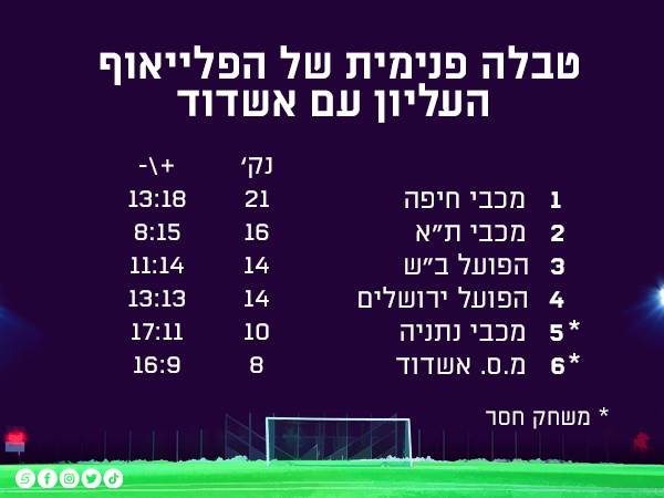 שבוע וחצי לשריקת הפתיחה של 10 המחזורים האחרונים ושל הישורת האחרונה במאבק האליפות, בדקנו איך תיראה הטבלה אם היא תכלול רק את שש הראשונות, ולא משנה אם מ.ס. אשדוד או בית"ר ירושלים שתסגור את העונה הסגירה בפלייאוף העליון, דבר אחד לא משתנה: מכבי חיפה נשארת במקום הראשון, ללא תחרות. היא עושה זאת גם בזכות ניצחון כפול על הפועל באר שבע, היריבה הכי ממשית שלה על התואר.