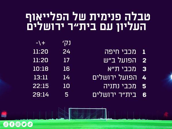 תמונת הפלייאוף העליון כמעט סגורה. חמש קבוצות הבטיחו את מקומן - מכבי חיפה, הפועל באר שבע, מכבי תל אביב, מכבי נתניה והפועל ירושלים. בעקבות ההפסד של הפועל חיפה בדרבי, נותרו רק שתי קבוצות במאבק על המקום האחרון בשישייה הראשונה: מ.ס. אשדוד, המקדימה את בית"ר ירושלים בשתי נקודות ותיקו מול נתניה צפוי להספיק למה במחזור האחרון.