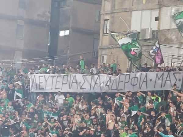לצד חוסר הסדר ביציעים, היה גם רגע של מחווה. במהלך המשחק, אוהדי מכבי חיפה הניפו שלט ביוונית ועליו הכיתוב: "חופש לאחים שלנו". הכוונה בשלט הוא לקבאלה גייט 13, אולטראס פנאתינייקוס, שנמצא ביחסים טובים עם הקהל הישראלי, כשאוהדי מכבי חיפה רצו להביע סולידריות עם חבריהם מיוון.
