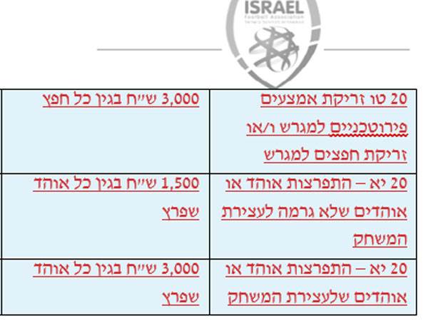 *התפרצות אוהד או אוהדים שלעצירת המשחק - 3,000 ש״ח בגין כל אוהד שפרץ (לקבוצה מקצוענית). 1,500 ש״ח בגין כל אוהד שפרץ (לקבוצה לא מקצוענית).