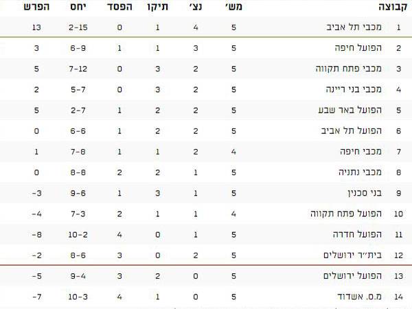 אחרי חמישה מחזורים, הטבלה נמצאת לפניכם - לכל הקבוצות יש חמישה משחקים מאחוריהן, למעט מכבי חיפה והפועל פתח תקווה שעדיין לא קיימו את משחק ההשלמה מהמחזור הראשון. נזכיר כאן כי לבית"ר ירושלים הופחתו ארבע נקודות בתחילת העונה, ולמכבי חיפה ובני סכנין הופחתה נקודת ליגה אחת.