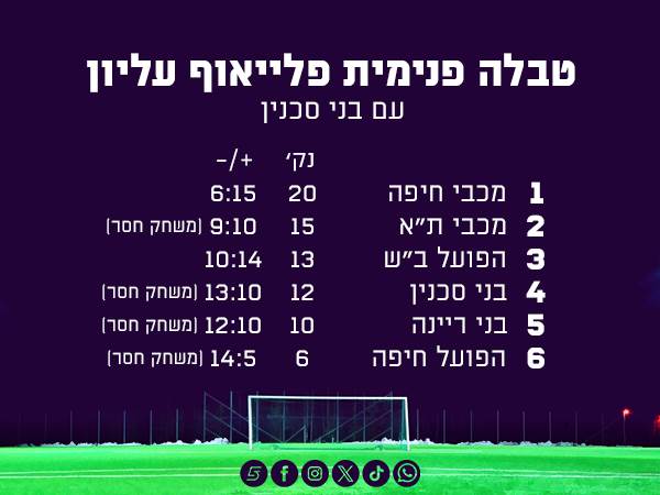 שש הקבוצות של הפלייאוף העליון ייפגשו פעמיים אחת מול השניה ויכריעו מי תהיה אלופה ומי תעפיל לאירופה. אם לשפוט על פי המפגשים ביניהן בעונה הסדירה, ובהנחה שסכנין תהיה בשישייה, צפוי לנו פלייאוף סוער. בטבלת המפגשים הפנימיים של הפלייאוף העליון עולה מכבי חיפה למקום הראשון, מרחק חמש נקודות ממכבי ת"א, לה משחק חסר (מכבי ת"א תפגוש את הפועל חיפה במחזור האחרון של העונה הסדירה). הרבה מהפער הזה הוא בזכות שני הניצחונות של הירוקים על מכבי ת"א בעונה הסדירה.