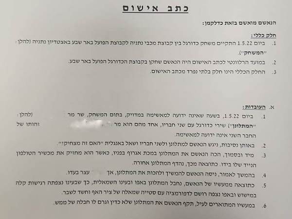 "במעשיו המתוארים לעיל, תקף הנאשם את המתלונן שלא כדין וגם לו חבלה של ממש", נכתב בכתב האישום וצויין עוד: "המאשימה מודיעה כי ישנה אפשרות שהתביעה תעתור למאסר בפועל בנוגע לנאשם".