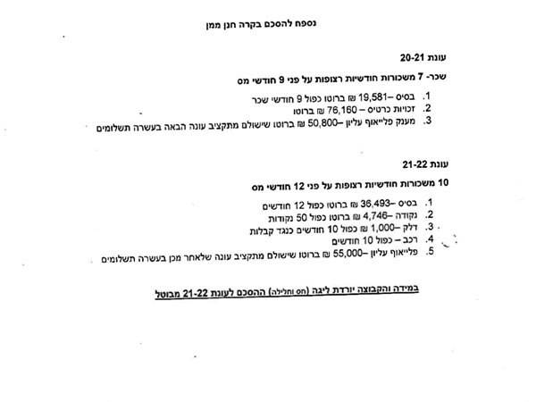 <strong>המספרים מאחורי התלוש.</strong> "ביציע העיתונות" - פירסמו את שכרו של חנן ממן בעונות 2020/21 ו-2021/22 בהפועל חיפה, כולל תלוש השכר שלו. בין הפרטים המעניינים: הבונוסים בחוזהו וסעיפי המשמעת.<br /><br /><strong>עונת 2020/21:</strong><br /><span style="text-decoration:underline;">שכר:</span> בסיס 19,581 שקלים ברוטו<br /><span style="text-decoration:underline;">העפלה לפלייאוף עליון:</span> 50,800 שקלים ברוטו<br /><span style="text-decoration:underline;">זכויות כרטיס: </span>76,160 שקלים<br /><span style="text-decoration:underline;">ביטול החוזה לעונה הבאה</span> אם הקבוצה יורדת ליגה<br /><br /><strong>עונת 2021/22:</strong><br /><span style="text-decoration:underline;">שכר:</span> בסיס 36,493 שקלים ברוטו<br /><span style="text-decoration:underline;">בונוס לכל נקודה:</span> 4,746 שקלים ברוטו<br /><span style="text-decoration:underline;">דלק:</span> 1,000 שקלים בחודש כנגד קבלות<br /><span style="text-decoration:underline;">רכב</span><br /><span style="text-decoration:underline;">העפלה לפלייאוף עליון:</span> 55,000 שקלים ברוטו<br /><br /><strong>סעיפי משמעת עיקריים:</strong><br />- <strong>איסור התערבויות והימורים</strong> הקשורים למשחקי הקבוצה<br />- דיווח מיידי לקבוצה אם הוא מקבל פנייה בנושא הימורים או התערבויות בנוגע למשחקי הקבוצה<br />- אם השחקן אינו מתאמן/משחק מחמת פציעות ו/או מחלה אך הוא מגיע לאספות, הוא יגיע <strong>בלבוש הולם ולא בכפכפים</strong>.<br />- <strong>איסור הדלפות</strong> לאמצעי התקשורת<br />- <strong>איסור יציאה לבילוי</strong> לאחר השעה 23:00 בלילה שלפני משחק