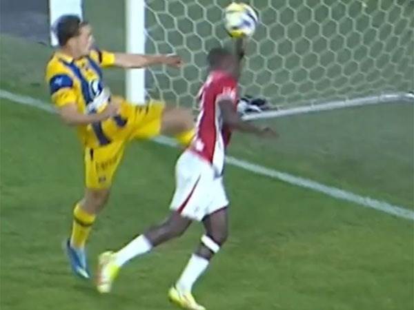 "יד, אני אומר לך זה יד. זאת זווית של יד. היד לפני הכדור", נאמר ע"י צוות שופטי המסך. "אנחנו בודקים אפשרות של נגיעת יד שהגול הובקע ממנה. גל, סמן טלוויזיה. אנחנו פוסלים את הגול על נגיעת יד".