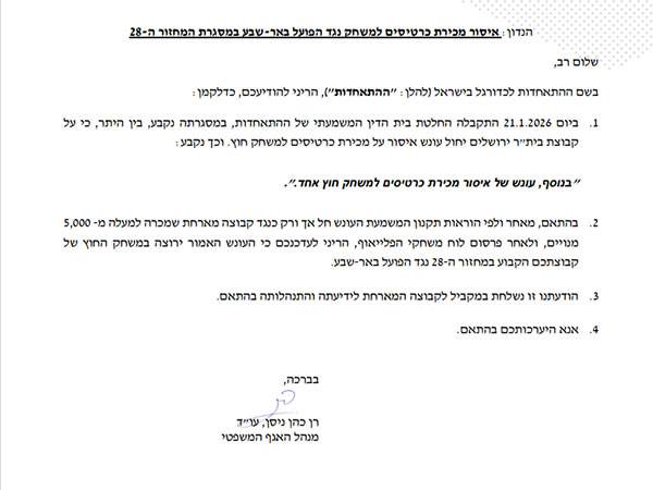 בהתאחדות לכדורגל שלחו מכתב לבית"ר עליו חתום מנהל האגף המשפטי עו"ד רן ניסן כהן, ובו נכתב: "ב-21.1.2026 התקבלה החלטת בית הדין המשמעתי של ההתאחדות, במסגרתה נקבע, בין היתר, כי על קבוצת בית"ר ירושלים יחול עונש איסור על מכירת כרטיסים למשחק חוץ" כתב מנהל האגף, "בנוסף, עונש של איסור מכירת כרטיסים למשחק חוץ אחד בהתאם, מאחר ולפי הוראות תקנון המשמעת העונש חל אך ורק כנגד קבוצה מארחת שמכרה למעלה מ-5,000 מנויים, ולאחר פרסום לוח משחקי הפלייאוף, הריני לעדכנכם כי העונש האמור ירוצה במשחק החוץ של קבוצתכם הקבוע במחזור ה28- נגד הפועל באר-שבע. הודעתנו זו נשלחת במקביל לקבוצה המארחת לידיעתה והתנהלותה בהתאם. אנא היערכותכם בהתאם".