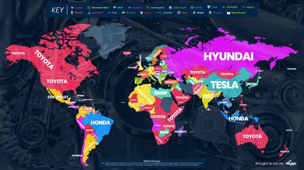 בפילוח הממצאים, נמצא כי טויוטה היא חברת הרכב המחופשת ביותר ב-57 מדינות בעולם מתוך ה-171, עם ממוצע של כ-7.8 מיליון חיפושים בחודש בסך הכול. בין המדינות שבהן שולטת יצרנית הרכב היפנית נמצא את ארה"ב, יבשת דרום אפריקה, קנדה, אוסטרליה ועוד. אין ספק שהקורולה – בין המכוניות הנמכרות ביותר בהסטוריה של ענף הרכב והנפוצה שבהן, עשתה עבורם עבודה יסודית לאורך השנים.