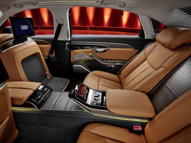 חלל הפנים של ה-A8 לוקח צעד גדול קדימה בכל הקשור לאפיון "הטרקלין הממונע", במיוחד עבור אלה שיושבים בשורה השנייה. אפשרויות ההתאמה האישית, כמו תמיד, לא נגמרות: גרסת בסיס הגלגלים הארוך, במיוחד, משלבת סאלון עם שזלונג לו מספר מצבים, החל משיכוך כריות של התמיכה הצידית והמותנית, ועד משענת הרגליים המחוממת עם עיסוי משולב - זוהי פונקציה הכוללת שבע תוכניות ו-18 כריות פנאומטיות. חסר לכם עוד? משענות הראש מתכווננות חשמלית, הקונסולה המרכזית האחורית באורך מלא (שניתן להשלים עם שולחנות נשלפים), מיני בוקס עם מקרר קטן והטאבלטים החדשים בגודל 10.1 אינץ' עם רזולוציית Full HD של מערכת הבידור, כולם תורמים לבידוד מלא מהסביבה.
