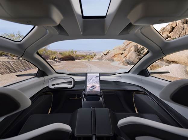 כניסה לרכב מתבצעת בזיהוי ביומטרי, וישנה יכולת זיהוי האם הנהג נושא עימו חבילה למשל, וידיו תפוסות כך שהדלתות יפתחו באופן עצמאי. תא הנוסעים עשוי 95% חומרים ממוחזרים ושדה הראייה כמעט 360 מעלות, עם חופת זכוכית בעלת מצבי הכהיה משתנים. המושבים ניתנים להזזה לאחור להגדלת מרווח הפנים על חשבון תא המטען וגם להגיע למצב שכיבה ולהנות מהנוף הנשקף.