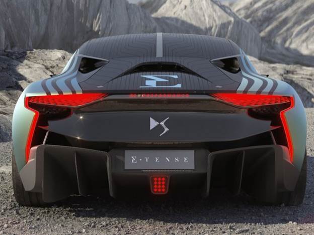 DS מתיזים על ה-E-Tense Performance מעין מרקחת צהובה מהולה בגוון ירקרק מושחר, "אדפטיבית", שמשנה את צבעה בהתאם אל זווית הראיה ומיקום קרני האור. הגג של ה-E-Tense Performance נמוך, נמשך ממש עד הזנב ואם יש משהו מקורי מאוד הוא העדר חלון אחורי. מאחור, מפזר גדול (דפיוזר) עם פנס ערפל ממורכז (הומאז' לפורמולה 1) מגדירים הנראות של העכוז המרשים, בעוד האורות האחוריים הם יחידות LED גדולות עם מוטיב יהלומים (כנהוג בכל דגמי החברה).
