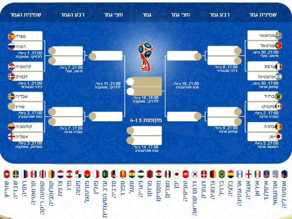 1. אורוגוואי/פורטוגל/צרפת/ארגנטינה - ברזיל/מקסיקו/בלגיה/יפן (21:00, 10 ביולי, סנט פטרסבורג)