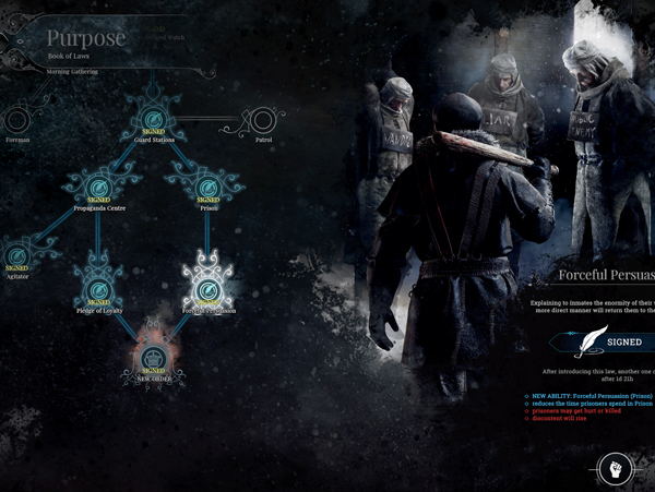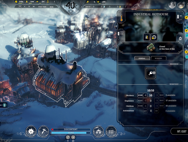עוד יום בשממה הקפואה, עוד יום של עבודה כדי לנסות לשרוד את האקלים הנוראי שפוקד את העולם ואופף אותו בקרח. העיר הקטנה שלנו היא המקום מפלט היחיד מפני סופת השלג התמידית שממשיכה לחבוט בכול הכוח בקירות שבקושי מצליחים להחזיק מעמד, ובמרכז העיר, הגנרטור העצום שנותן לנו חום, אנרגיה ומחזיק אותנו בחיים. אבל כדי שהוא ימשיך לפעול אנחנו צריכים פחם או עצים, שני דברים שמאד קשה להשיג ותמיד חסר בהם. אבל המשאב הכי נחוץ הוא אנשים, כי אם אין מי שיפעיל את הגנרטור וישמור עליו פעיל, העיר תקרוס ותקפא. ואנשים זה בדיוק מה שחסר לי, כל המשלחות הקודמות ששלחתי כדי למצוא משאבים או אנשים חזרו ללא ניצולים חדשים, והמצב הפך להיות כה קשה שהתחלתי לשלוח ילדים לעבודות כפיים כדי להתמודד עם הדרישה העולה לפחם. אומנם זה לא עשה אותי פופולארי בקרב אנשי העיר, אבל הגנרטור ממשיך לעבוד והעיר ממשיכה לתפקד. אבל לא להרבה זמן, והזמן הולך ואוזל, ההחלטה שלי היא לא פשוטה: לשלוח עוד משלחת נוספת ולמצוא עוד ניצולים או להתחיל להעביד את כוח העבודה הקיים במלוא המרץ. שתי ההחלטות עלולות לגרום לאנשי העיר לפתוח במרד מה שאומר שראשי ילך לגרדום, אבל אם אני לא אעשה משהו אז כל העיר תהפוך לעוד בית קברות קפוא. פרוסטפאנק הוא משחק בנייה וניהול עיר/ הישרדות שמגיע מחברת 11bit Studios שהביא לנו את This War of Mine המעולה ששם אותנו בנעליהם של אזרחים פשוטים שמנסים לשרוד בזמן מלחמה. העולם של Frostpunk זורק אותנו לעידן קרח פתאומי שתוקף את כדור הארץ. הניצולים היחידים שהצליחו לשרוד התאגדו יחדיו והקימו עיר קטנה מסביב לגנרטור חבוט שהוא גם המקור היחיד לחום. אנחנו נשחק את המושל של העיר שאחראי על הבנייה של העיר, יצירת כוח עבודה, כתיבה ואכיפה של חוקים וכמובן לדאוג שהעיר תצליח לשרוד. אבל כל פעולה או החלטה שתבצעו תשפיע על הנאמנות של אנשי העיר, ונאמנות היא דבר הפכפך ובמידה ואנשי העיר יחליטו שנמאס להם, אתם מאד מהר תמצאו את המושל שלכם מוצא להורג בכיכר העיר. שיטת המשחק מאד מזכירה משחקי בנייה ולוגיסטיקה קלאסיים, אתם תצטרכו למנות את הניצולים שלכם לתפקידים שונים בעיר בין אם זה בניית מבנים חדשים, איסוף משאבים, טיפול בגנרטור או יציאה למשלחות. מבנים חדשים יעניקו לכם בונוסים לנקודות משאבים, יאפשרו לאוכלוסייה שלכם מקום ללון, לבנות ציוד או לחקור טכנולוגיה חדשה או יספקו שעשוע ופנאי עם מבנים כמו פונדק או זירת קרבות שישמרו על אנשי העיר עסוקים ושמחים. אבל כדי לבנות את המבנים אתם תצטרכו לאסוף משאבים כמו עצים, פחם, ברזל ואוכל, מה שאומר לשלוח את אנשי העיר לכרות עצים, פחם ולצוד או לאסוף אוכל. תוכלו גם לשלוח את אנשי העיר למשלחות לשממה הקפואה כדי לחקור מקומות, למצוא ניצולים או מצבורי משאבים, אל הסכנה היא שהם עלולים לחזור בידיים ריקות או לא לחזור בכלל. חוץ מעיסוקים לוגיסטיים אתם גם תחוקקו חוקים חדשים שיעזרו לכם לשלוט על ההמון. חלק מהחוקים נותנים לכם יכולות בנייה חדשות ותפקידים ומקצועות חדשים לאנשי העיר או קביעת שעות עבודה נוספות, חלוקת מזון נוספות, קבורה דתית וחוקים בסיסים שצריך כדי שהעיר תתפקד כמו חברה אנושית והגיונית. אבל ככול שתתקדמו במשחק תצטרכו לחוקק חוקים יותר קיצוניים כגון פתרון מחלוקות בזירת הקרבות, קצירת איברים, הוספת נסורת עץ לאוכל וכמובן גיוס ילדים לכוח העבודה שאומנם יעזרו לעיר לשרוד בתנאי עידן הקרח שפוקד אתכם אבל גם יפגע בנאמנות של אנשי העיר מה שיכול לגרום להם לעבוד פחות טוב, לגנוב משאבים, לברוח מהעיר או לגרום להפיכה בעיר. המשחק גם ידאג לזרוק לכם מדי פעם אירועים אקראיים ויכריח אתכם לעשות בחירות לא קלות שיכולות להרוג לכם כמות מסוימת של אנשים או לאיבוד משאבים אבל אירועים אלו יכולים גם להועיל לכם ולזכות אתכם בתוספת למשאבים, בניצולים חדשים בעלי מומחיות או מבנים חדשים על חשבון נאמנות, נזק לעיר או פגיעה במשאבים, הבחירה היא בידכם. מפתחי המשחק הצליחו לגרום ל-Frostpunk לתפוס את תחושת אפוקליפסת עידן הקר