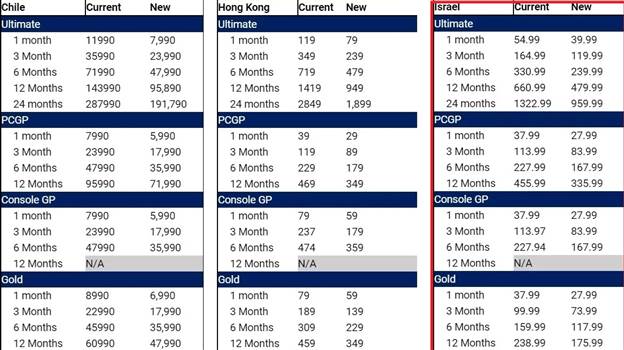 גיימרים ישראלים שעד כה שילמו 55 שקלים (17$~) עבור מנוי האולטיימט, אותם מנויים ישלמו כעת 40 שקלים, שהם כ-12.45 דולר. בנוסף גם מחיר האקס בוקס לייב גולד ירד מ-38 שקלים בחודש ל-28 שקלים מחודש אוקטובר.
