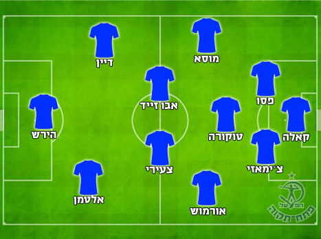 הרכב משוער: רן קדוש; עלי עותמאן, אברהם פאס, עלא אבו סלאח, איגור יובאנוביץ', מיחה מביליה, חאלד חלאילה, יאניס פפאדופולוס; פיראס מוגרבי, אחמד אבו נהייה, מילאן בויוביץ'. [תומר לוי]
