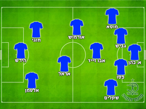 הרכב משוער: איתמר ניצן; דור אלו, איבן הרצג, עומר דנינו, דניאל דימוב, חגי גולדנברג; בראיין גרזיצ'יץ', מרוואן קבהא, יואכים מונונגה; גיא מלמד, רועי דיין.