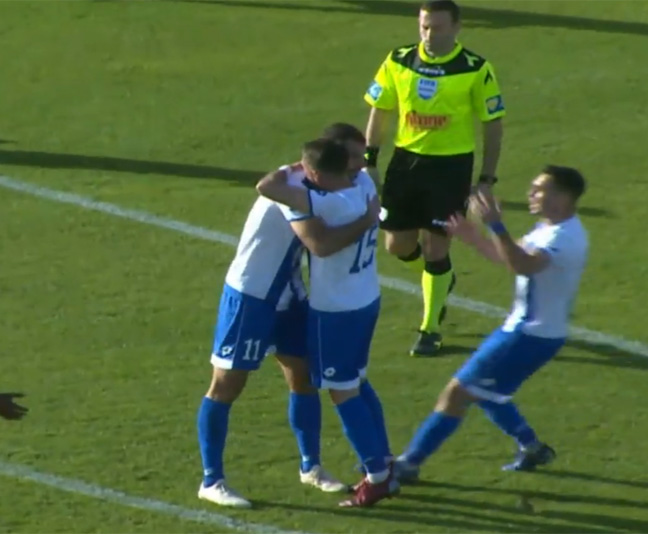 שער! רגע לפני השריקה למחצית, תומר אלטמן מניף את הרגל ושלח טיל אדיר לרשת. 0:2 לת"א/רמלה על אחי נצרת של מוטי איווניר